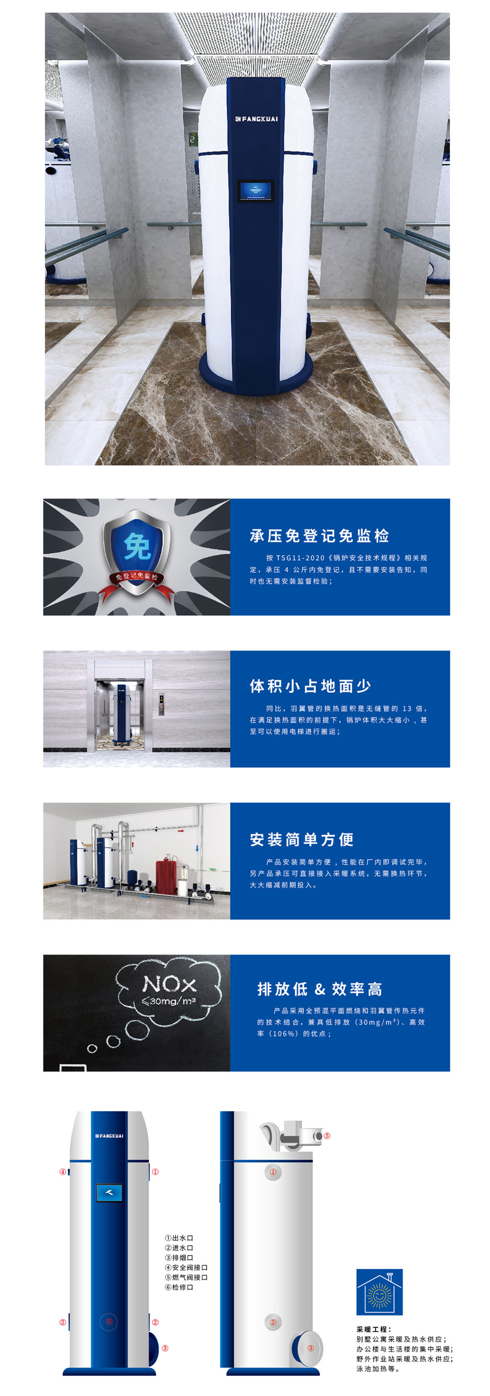 可承压使用且无需监检,体积小占地面积小,安装简单方便,排放低效率高