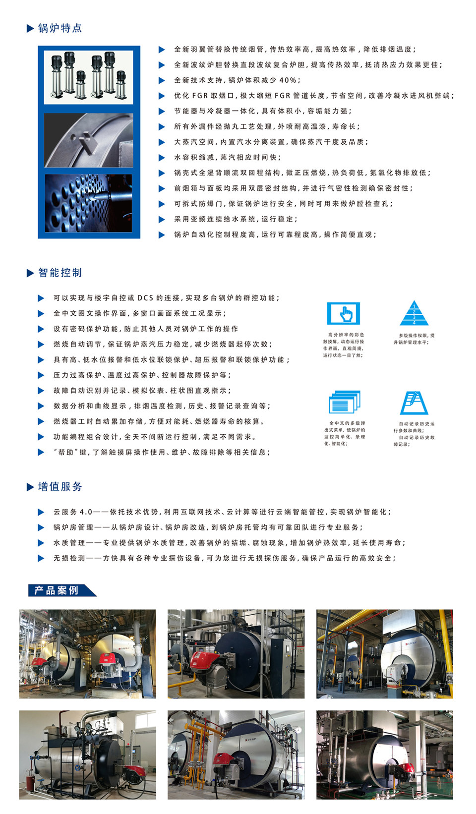 自主研发FGR技术 实测NOX<27mg/m3 符合一级城市排放标准 北京多家供热单位主选产品 锅炉热效率高 智能运行 节省大笔开支 水垢检测、烟温检测等预警装置 全方位保障锅炉运行安全 适用范围:包装行业、制药行业、化工行业,液体饮料、热力公司、生物发酵工程等
